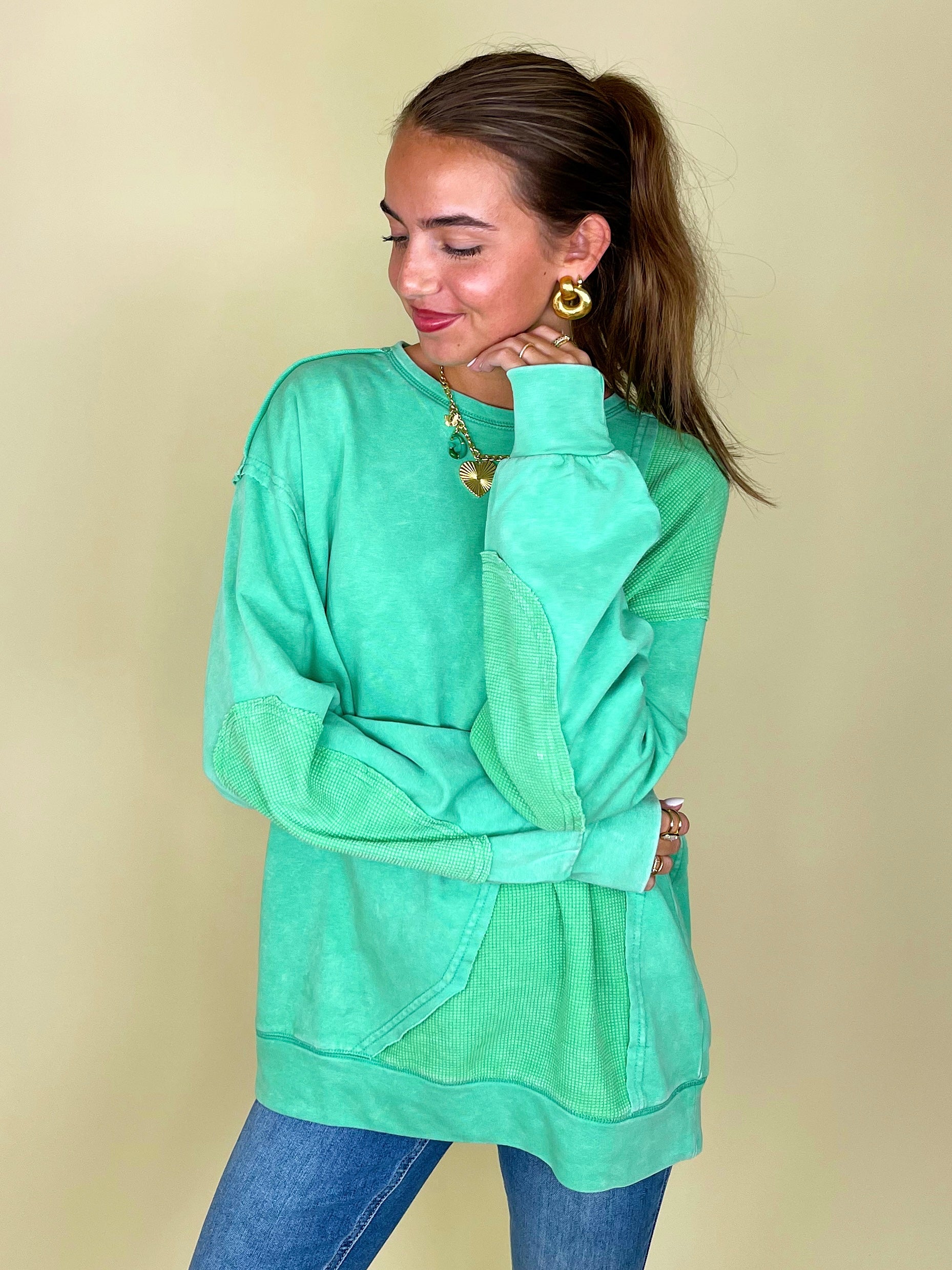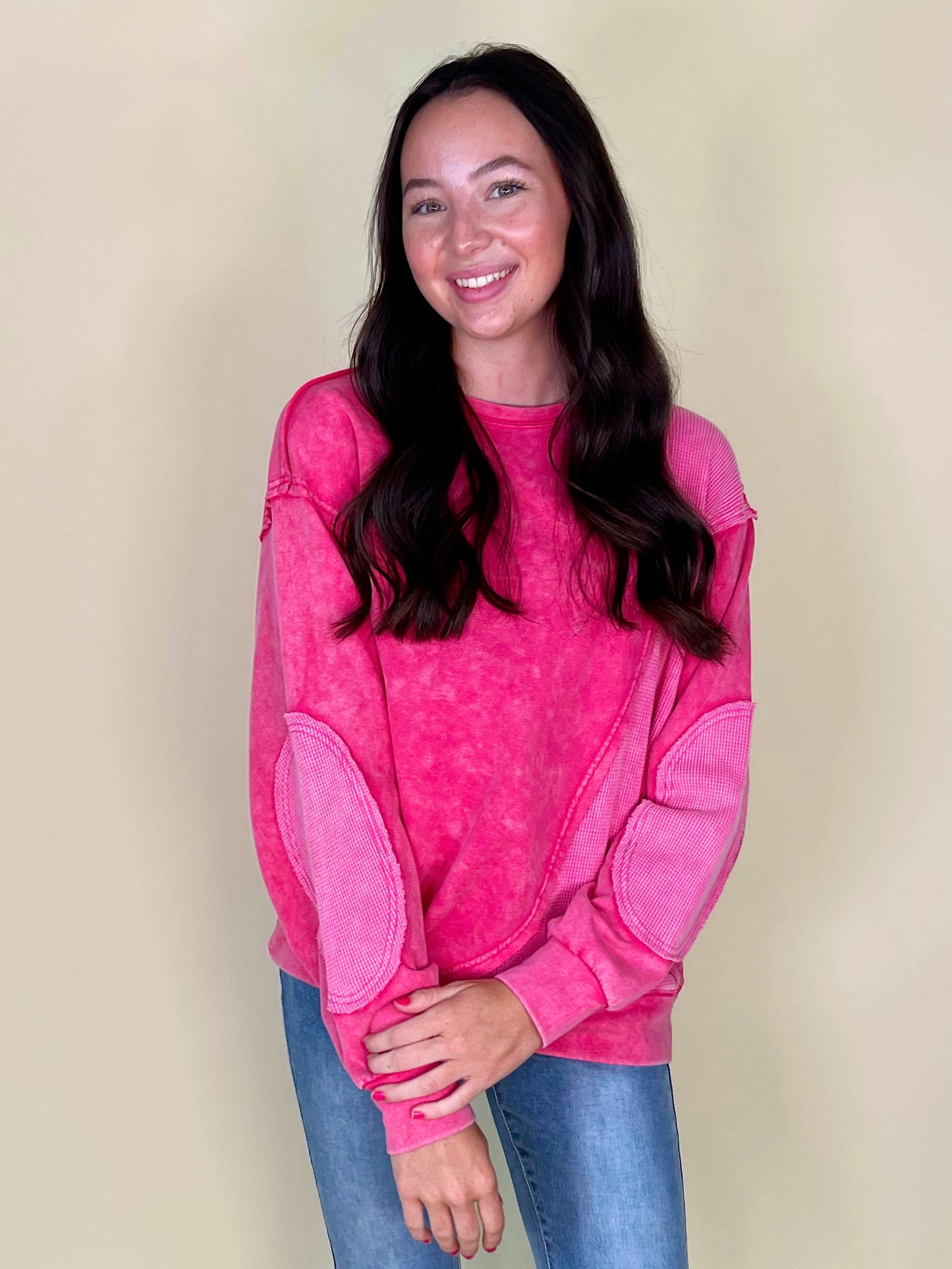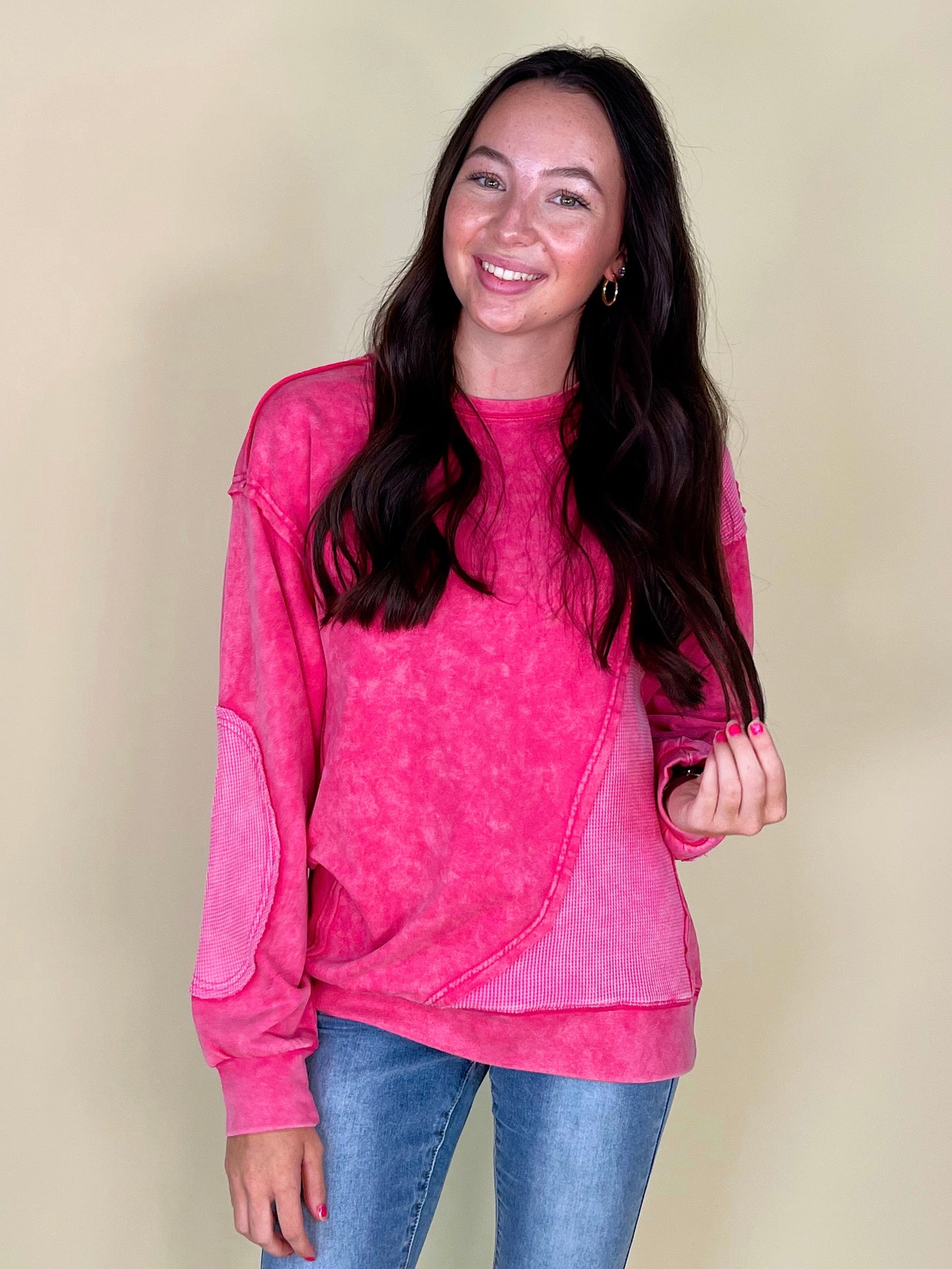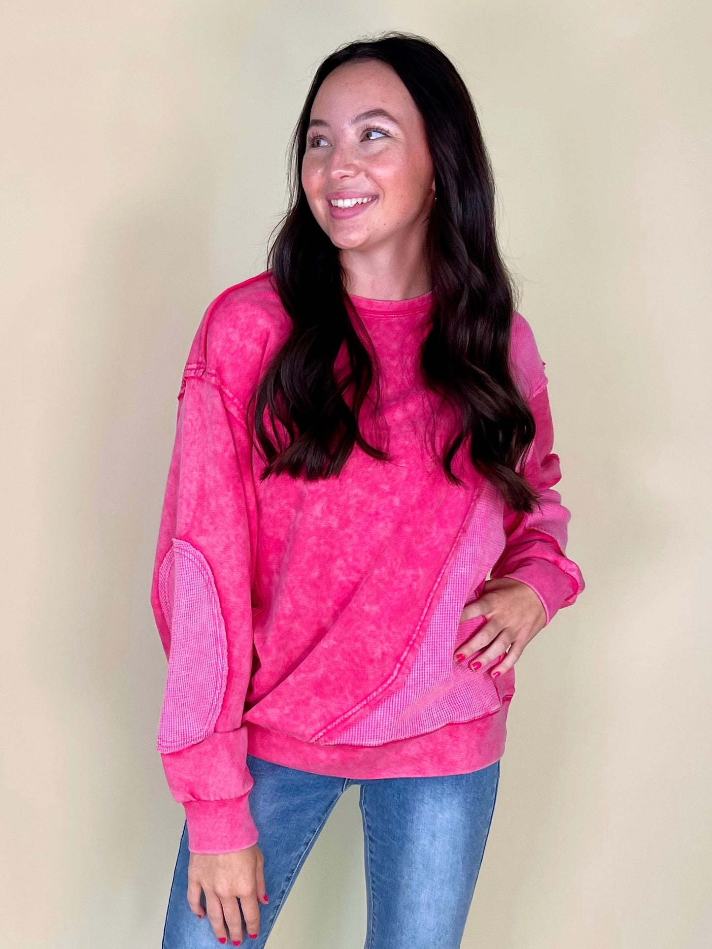 Thermal takes us right to the autumn state of mind, so the thermo deats on The Lilly Sweatshirt definitely has us in our fall feels! This mineral washed relaxed fit crewneck showcases contrasting thermal patches, relaxed long sleeves with banded cuffs, a loosely fitting banded hemline, and a 100% cotton fabric that keeps things durable and comfortable.