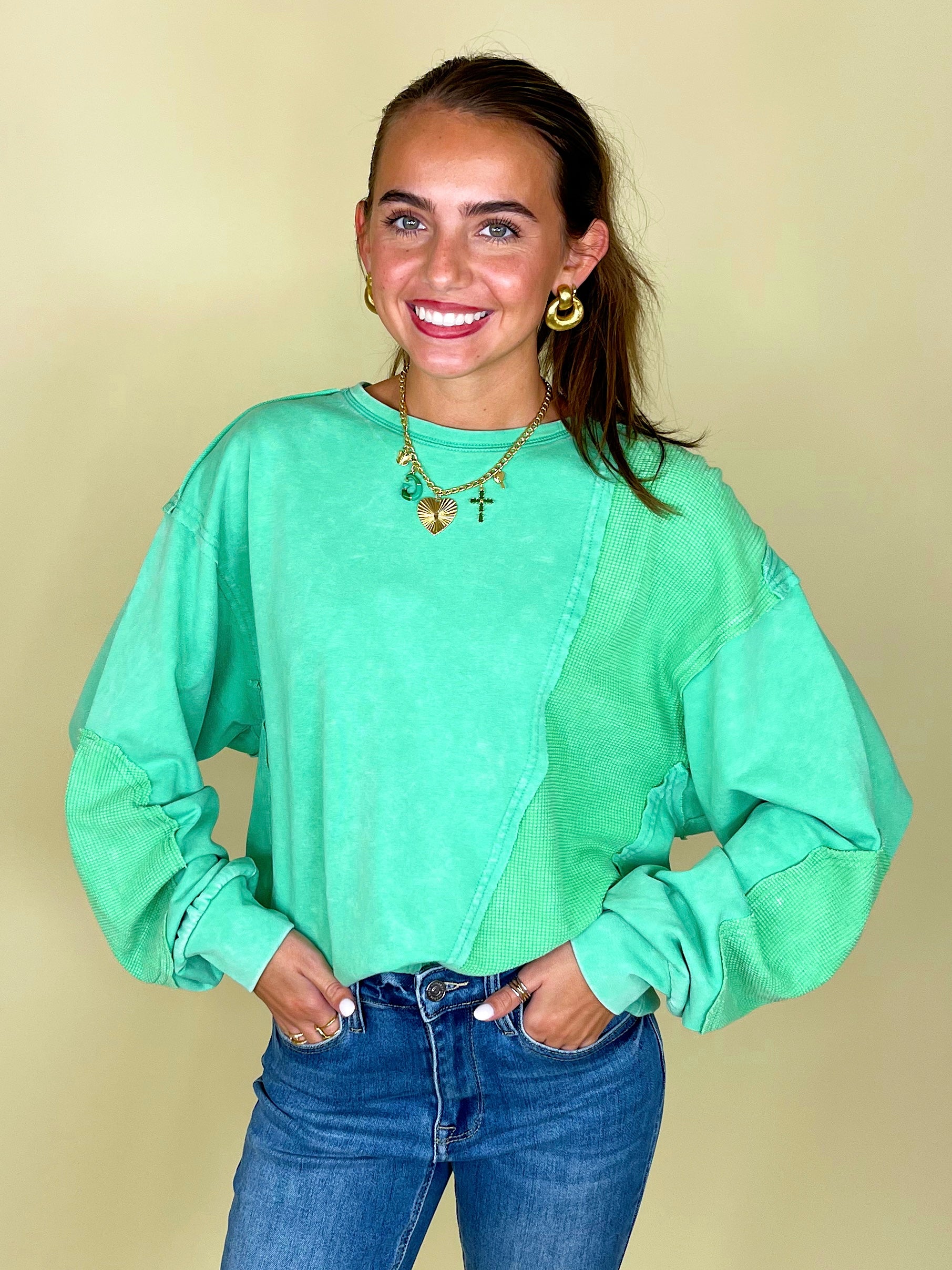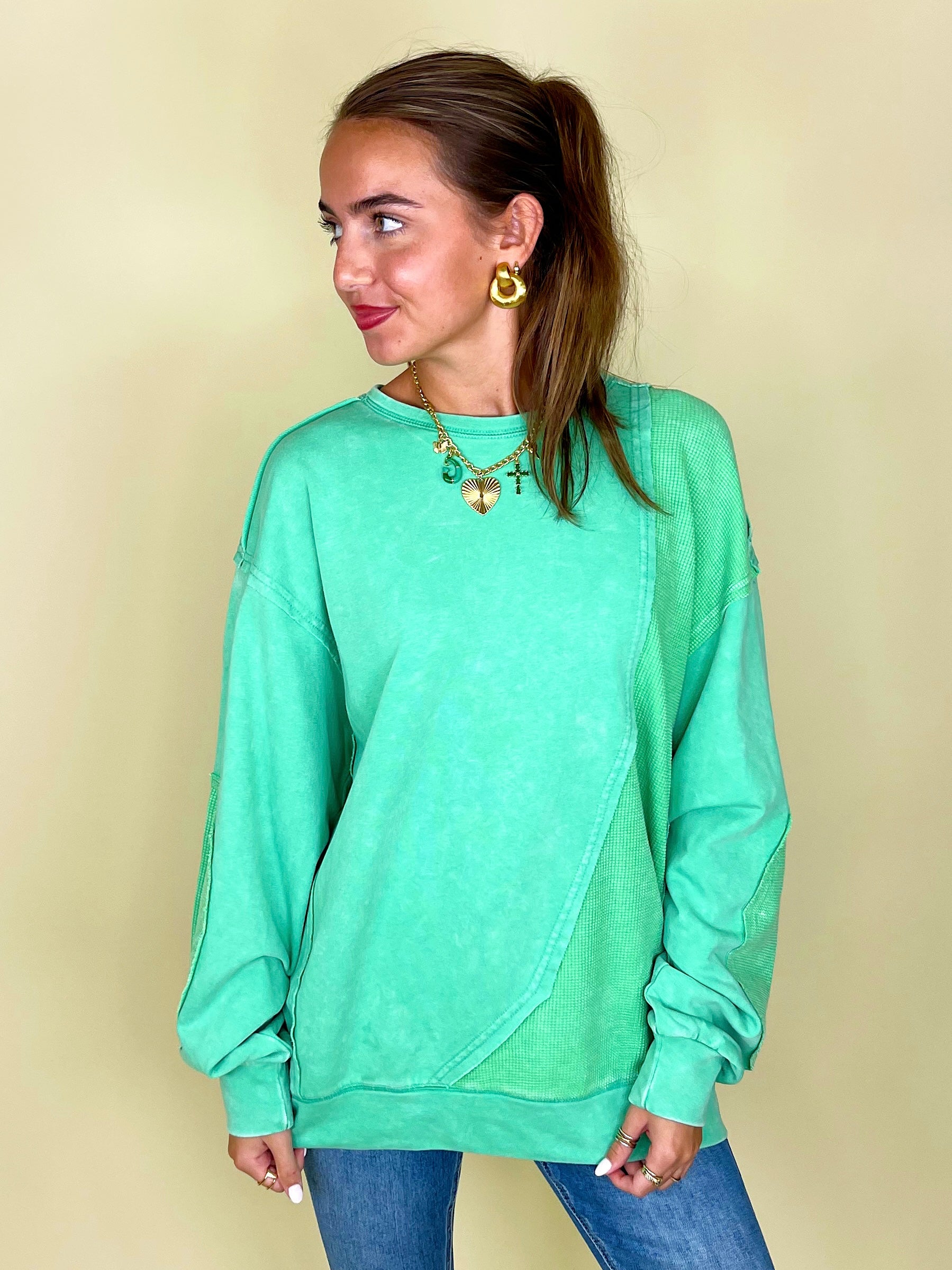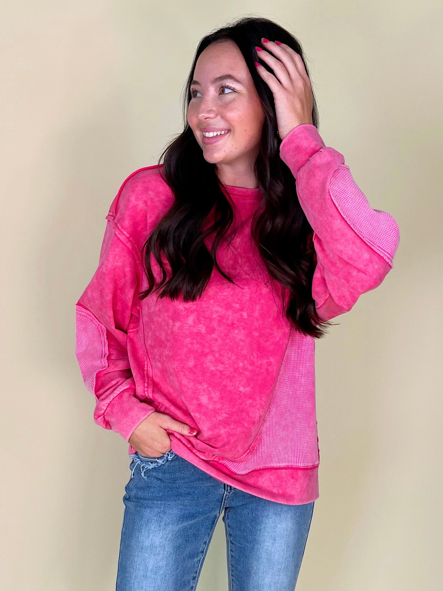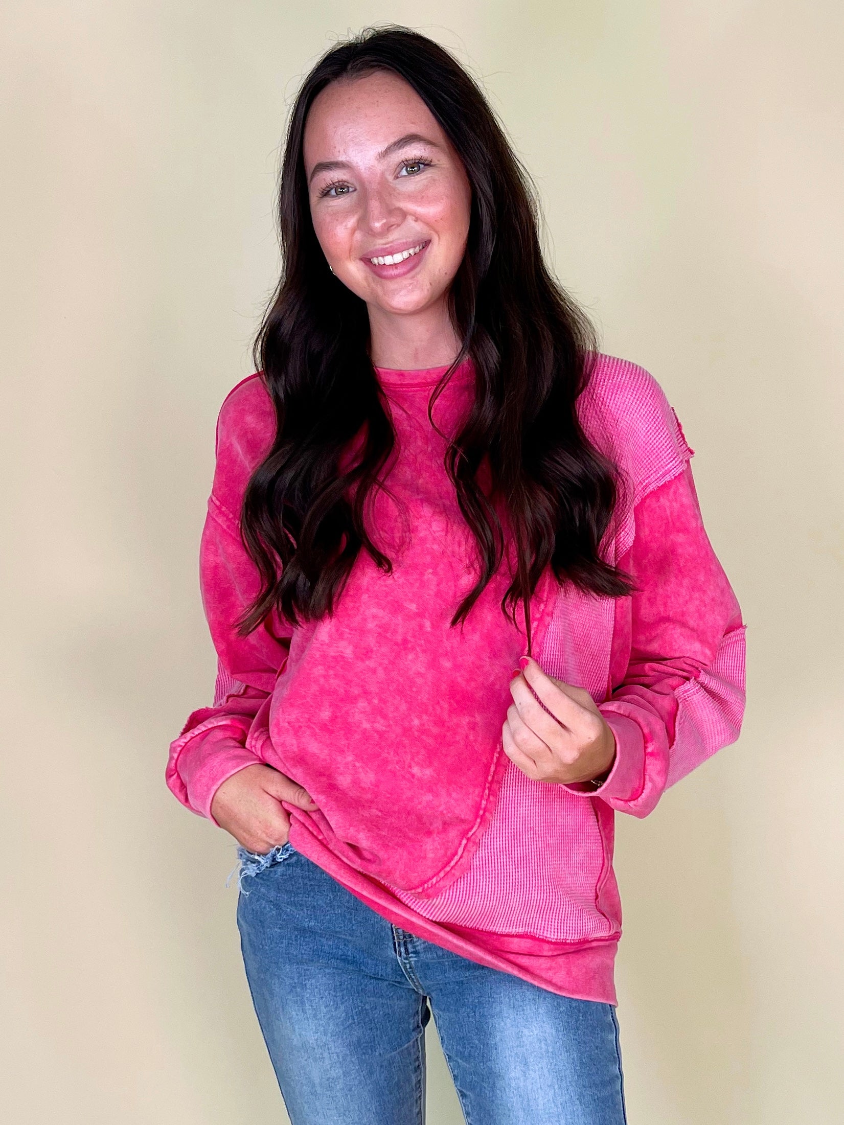 Thermal takes us right to the autumn state of mind, so the thermo deats on The Lilly Sweatshirt definitely has us in our fall feels! This mineral washed relaxed fit crewneck showcases contrasting thermal patches, relaxed long sleeves with banded cuffs, a loosely fitting banded hemline, and a 100% cotton fabric that keeps things durable and comfortable.