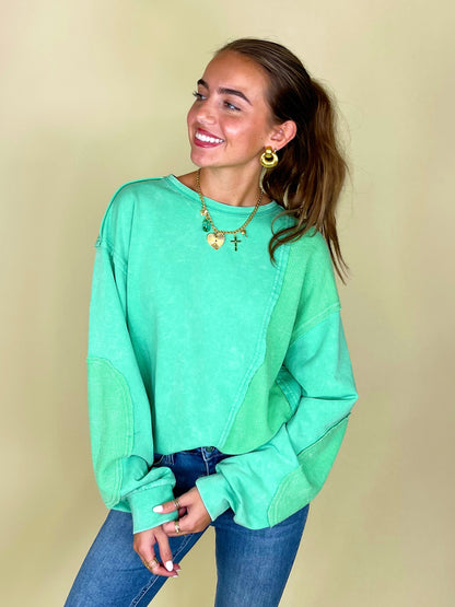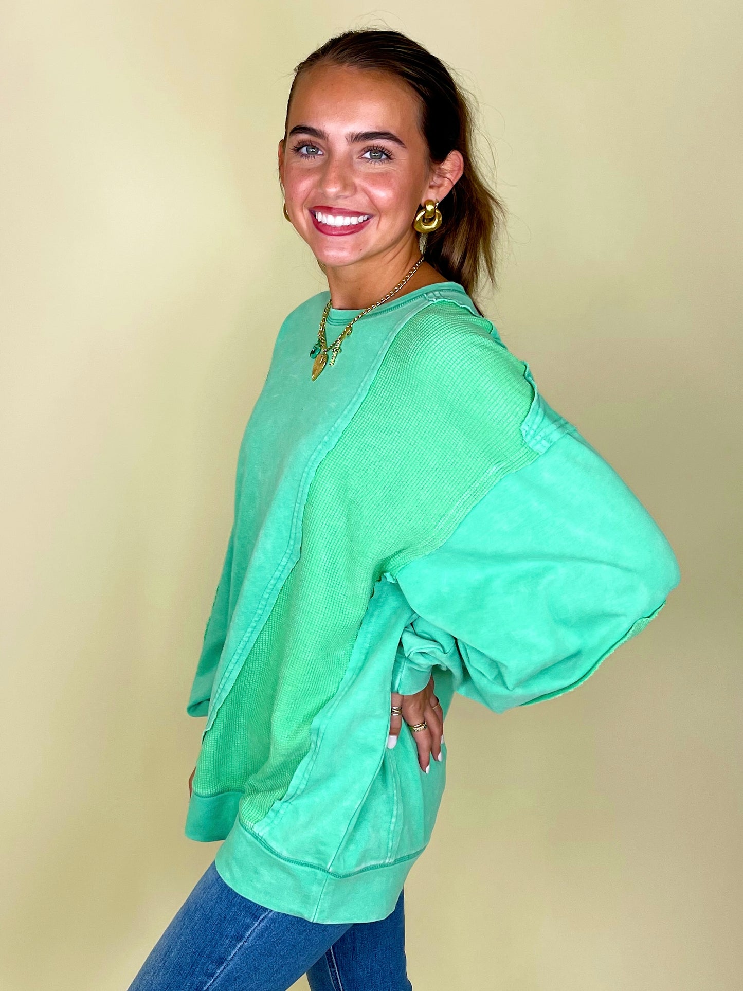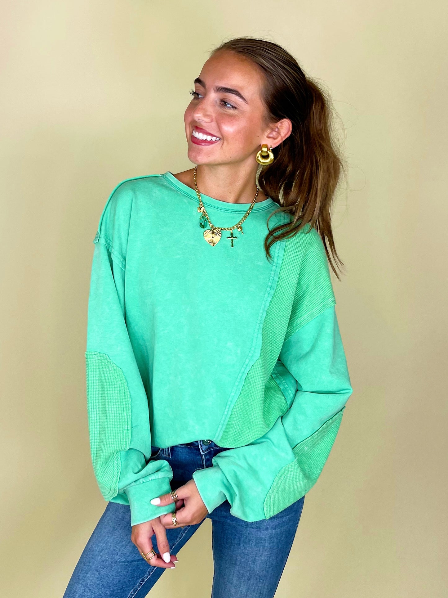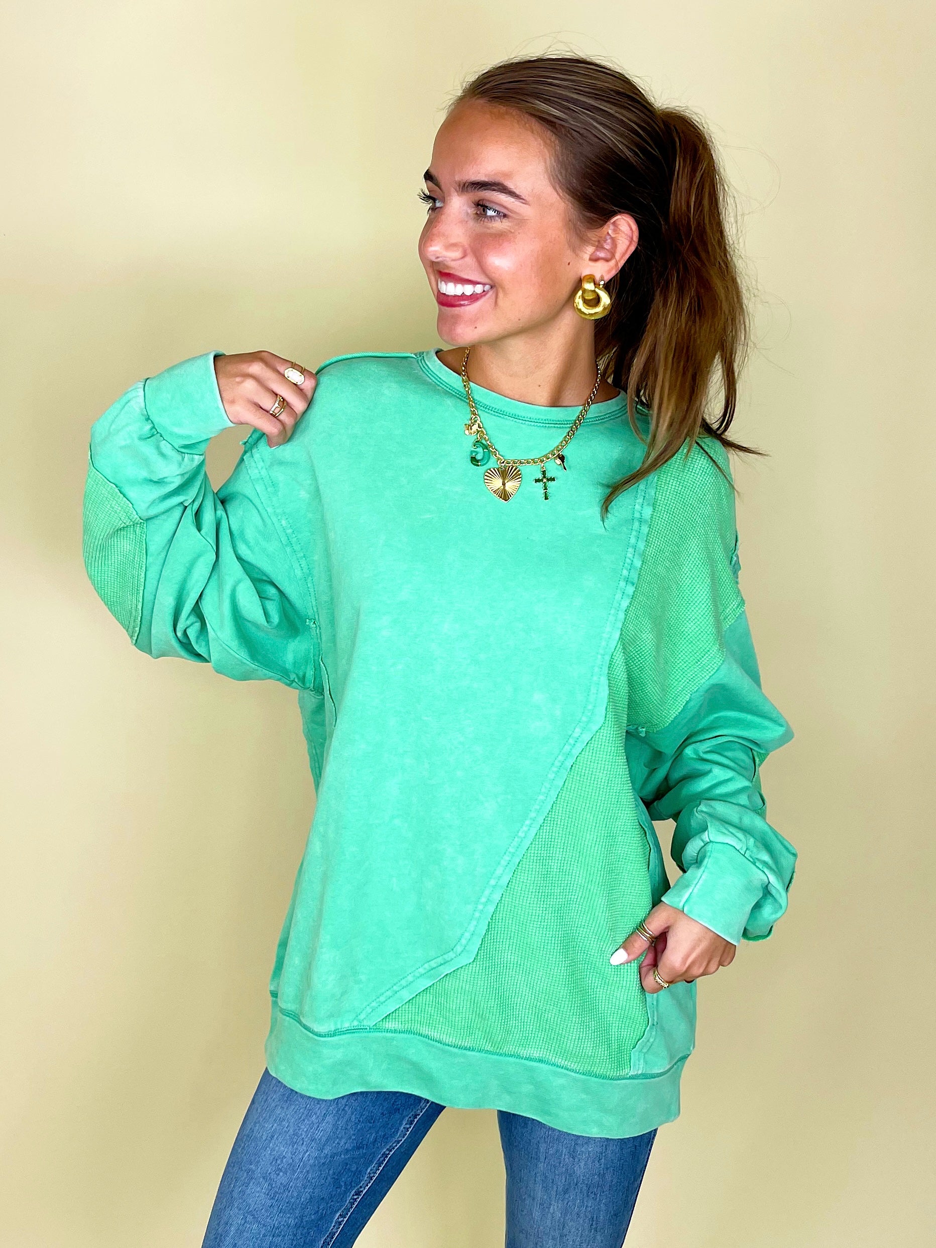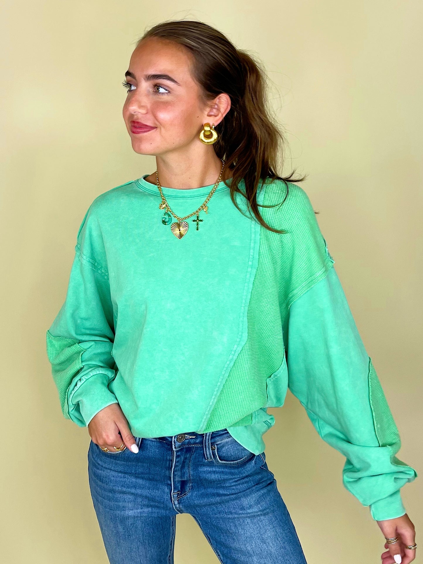 Thermal takes us right to the autumn state of mind, so the thermo deats on The Lilly Sweatshirt definitely has us in our fall feels! This mineral washed relaxed fit crewneck showcases contrasting thermal patches, relaxed long sleeves with banded cuffs, a loosely fitting banded hemline, and a 100% cotton fabric that keeps things durable and comfortable.
