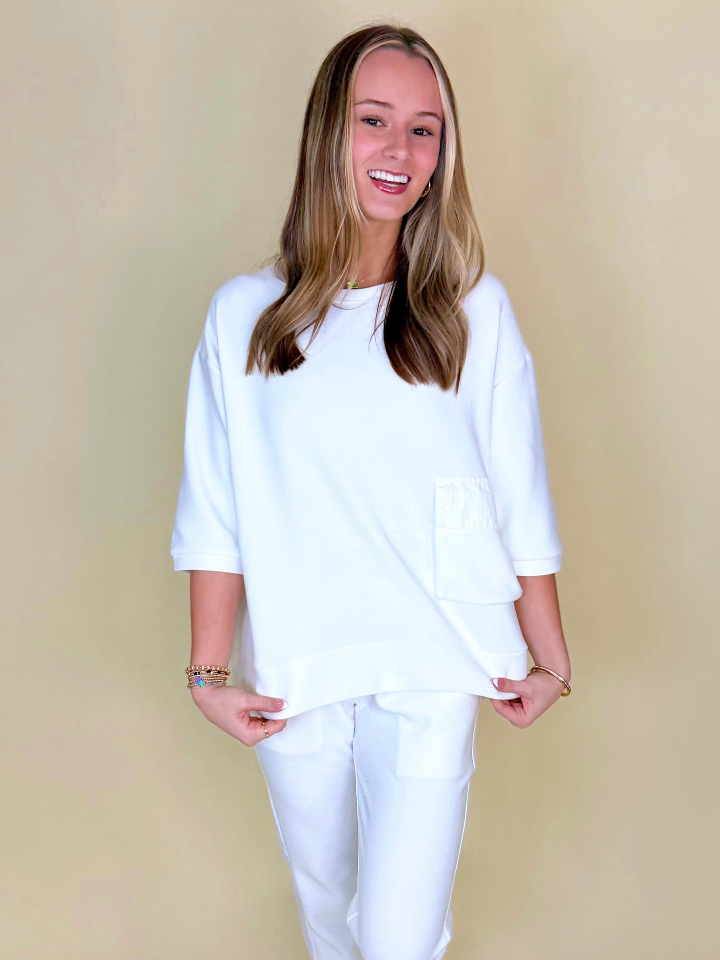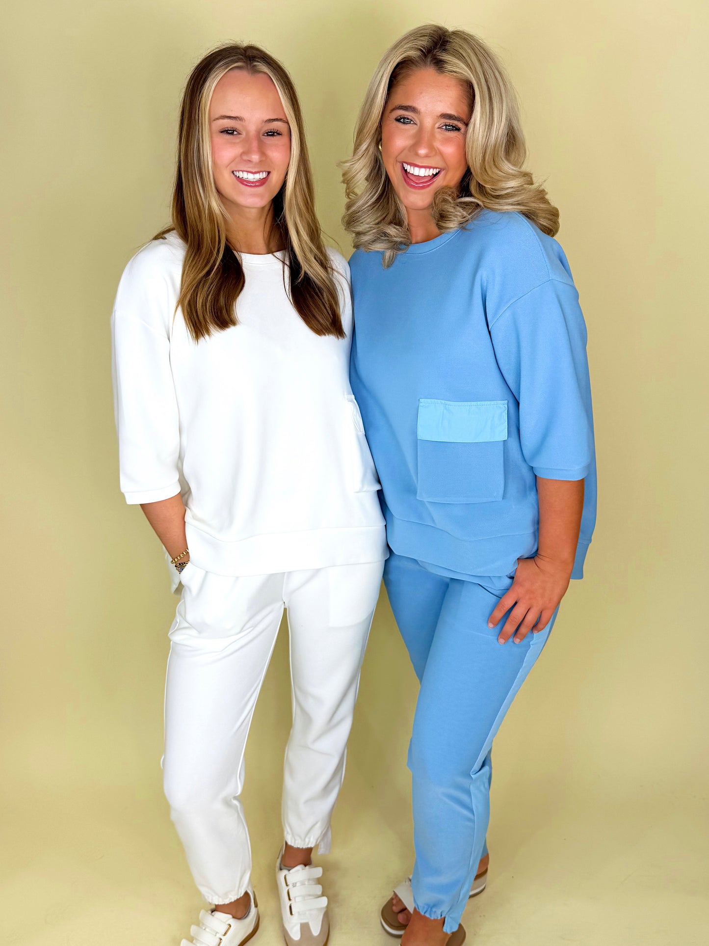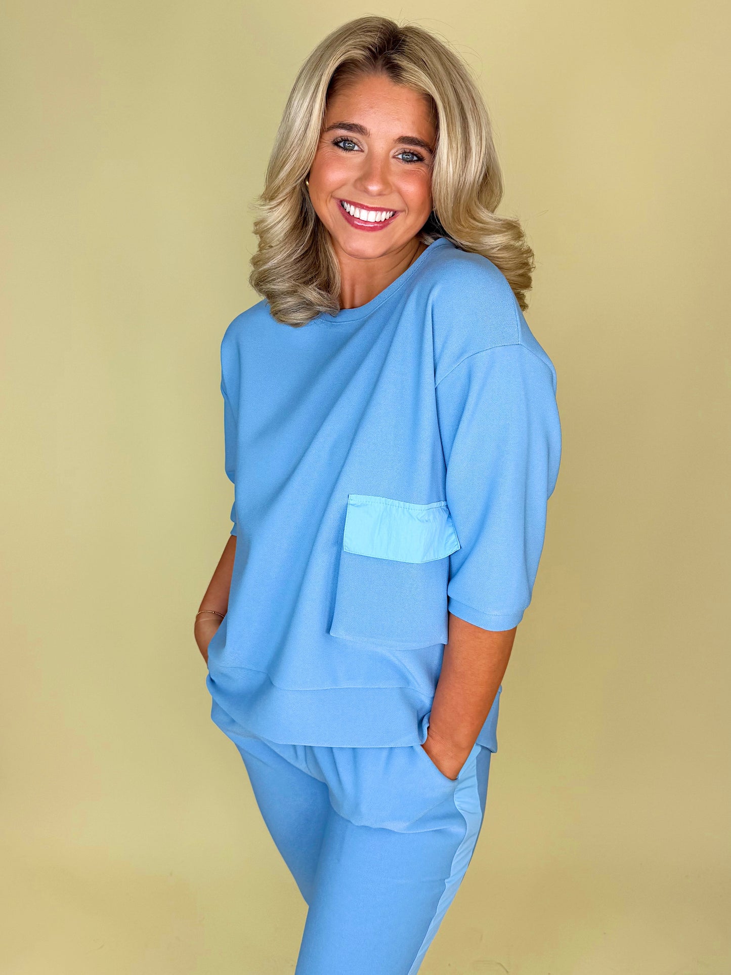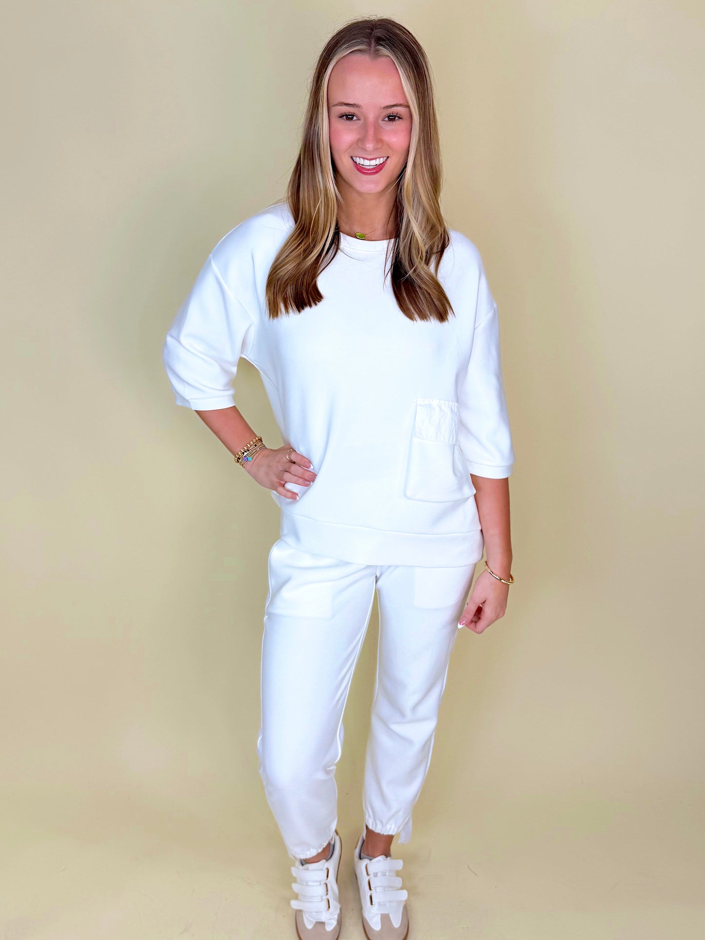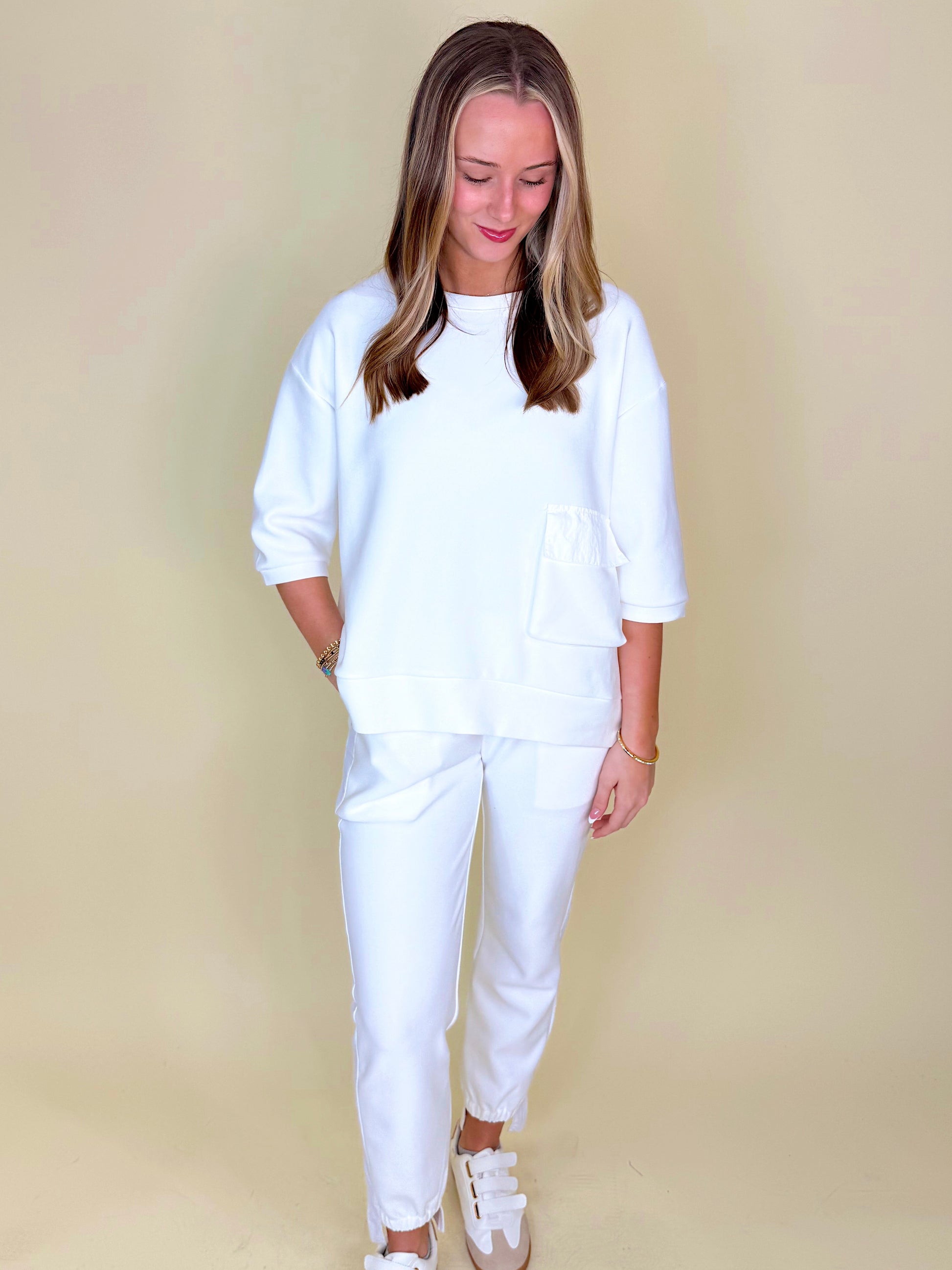 Matching sets are the best style of every season! The pieces of The Sunday Set are a match made in heaven, destined to be worn together for that classic go-getter look. The contrasting fabrics of this style make for an elevated, expensive look that will take your everyday matching sets to the next level. The beautiful front pocket detail on the top and asymmetrical ankle cuff of the jogger are just some of the details that take this set to new heights. Feel lavish in this elevated essential set no matter which color you choose!