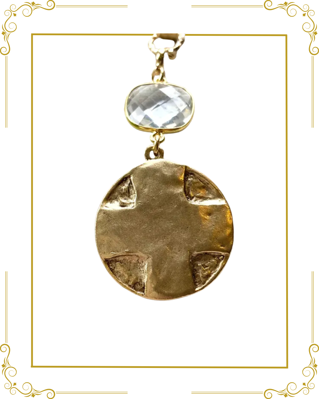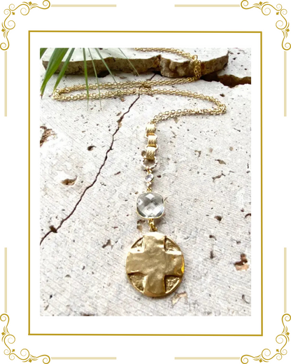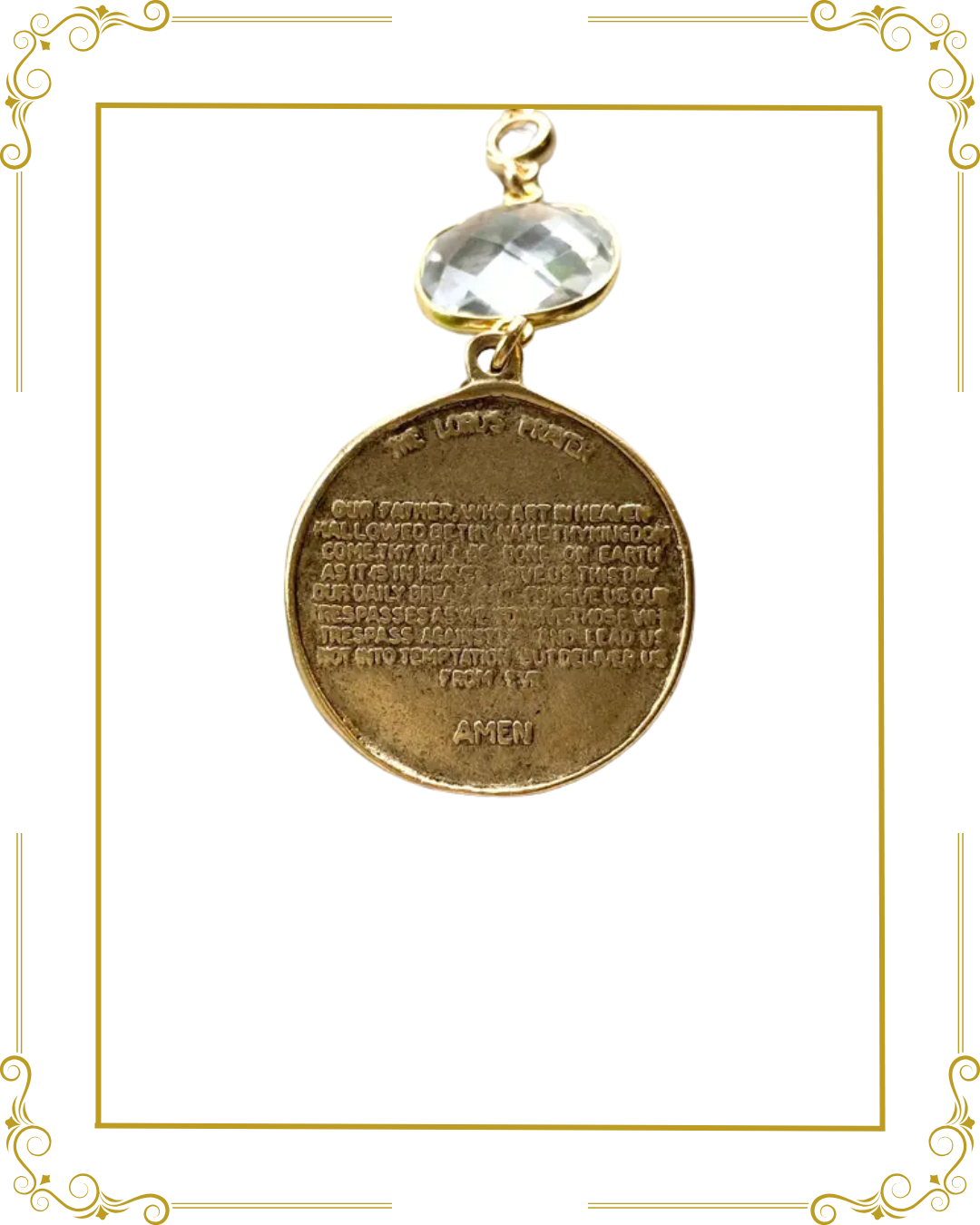 This beautiful gold pendant is hand casted from an actual Vintage religious medallion. It is reversible and features a cross on one side and the Lords prayer on the other. It’s connected to a genuine piece of crystal quartz which is known as the “healing crystal." This is a beautiful meaningful necklace makes a great gift!